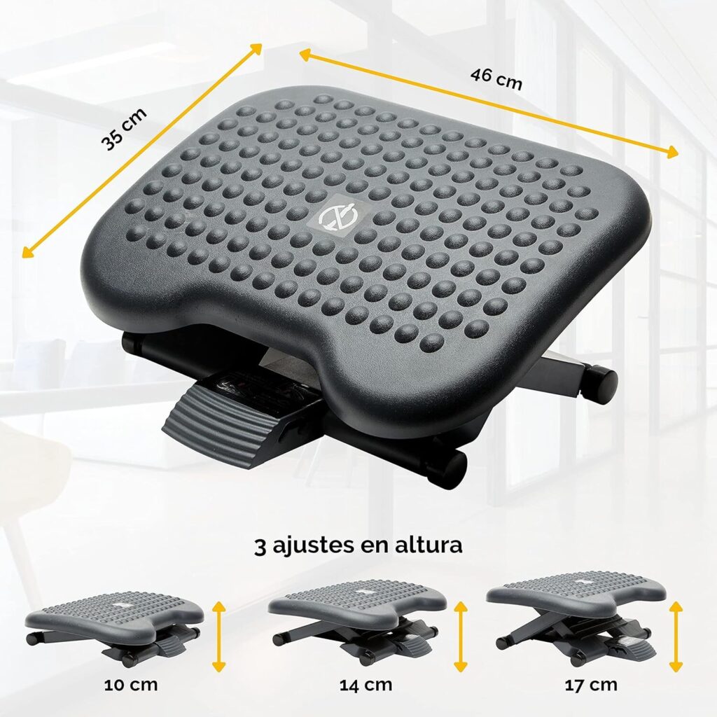 El reposapiés ayuda a mantener una posición correcta al sentarse, mejora la circulación sanguínea y reduce la presión en la zona lumbar. Es un complemento indispensable para quienes trabajan muchas horas frente al ordenador o buscan prevenir molestias posturales.