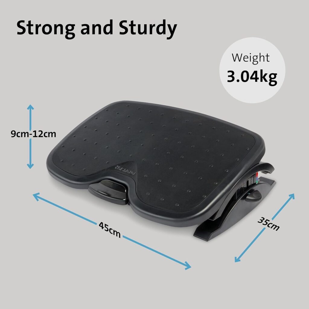 Fabricado con materiales robustos y superficie de goma antideslizante, este reposapiés es altamente ajustable y duradero. Su ángulo de inclinación se regula fácilmente con el pie.